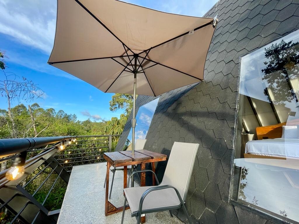Cabaña para parejas “Nido de Pájaro”, con una arquitectura única y acogedora, ubicada en una zona alta con una vista encantadora. Cuenta con aire acondicionado, televisor y baño privado, ofreciendo todas las comodidades en un espacio diferente y especial, ideal para tener contacto con la naturaleza.
