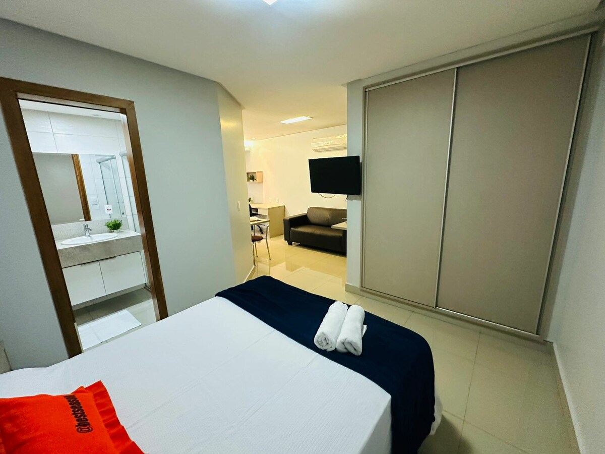 現代化45平方公尺的單間公寓,位於SETOR BUENO頂端,在T-37與T-63上。 靠近 Mater Dei 醫院、Vaca Brava 公園、Goiânia 購物中心和 ORION 醫療中心,非常適合休閒、諮詢、考試或工作。 該地區有Pão de Açúcar、Oba Hortifr、市場、藥店、咖啡店和各式各樣的美食。 房源提供一張標準雙人床、一張額外的床、冷氣、快速Wi-Fi、智慧電視和設備齊全的廚房,確保舒適、實用和舒適的住宿,非常適合不同的需求。