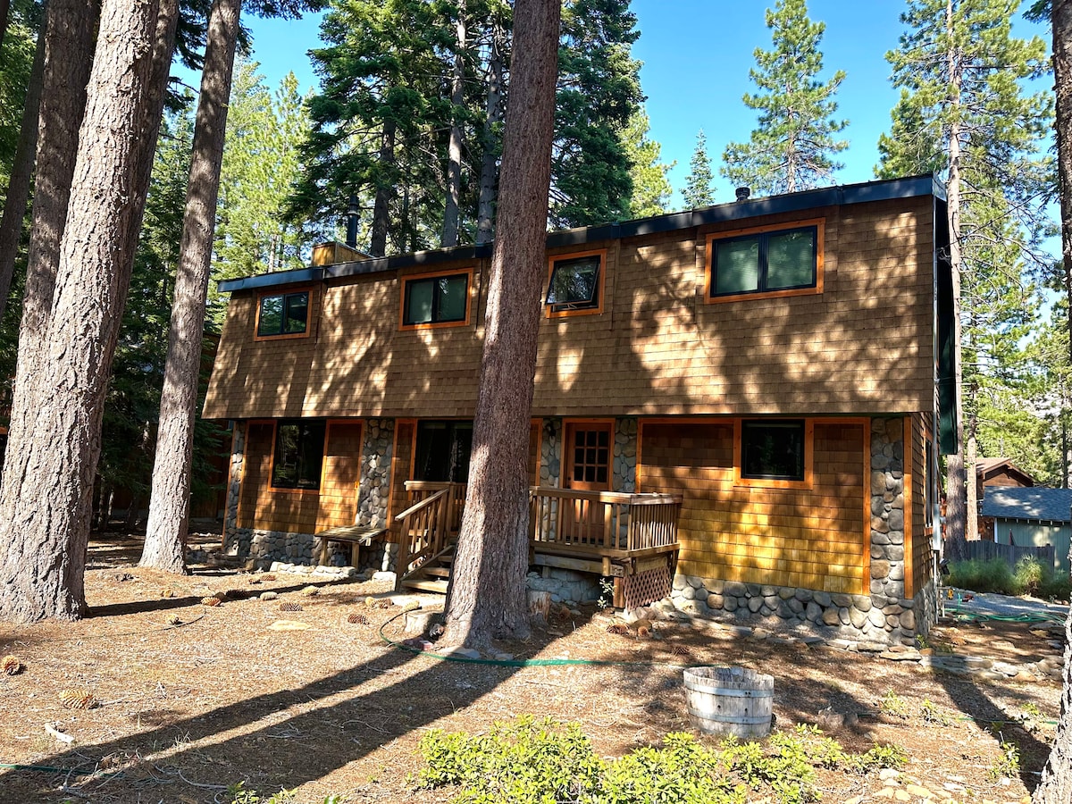 Now with air conditioning! Renovated A-frame cabin, nestled in a fantastic and private neighborhood. Perfectly situated between Northstar, Squaw, Tahoe City and Kings Beach. There is a massive adjoining lot to enjoy, as well as hundreds of miles of biking, hiking and fishing trails within a few blocks. There is a bedroom downstairs with an accompanying bathroom, as well as a lofted bedroom upstairs with adjoining bathroom. 250mb mesh WIFI connection, Tesla EV charger (usage rates apply)