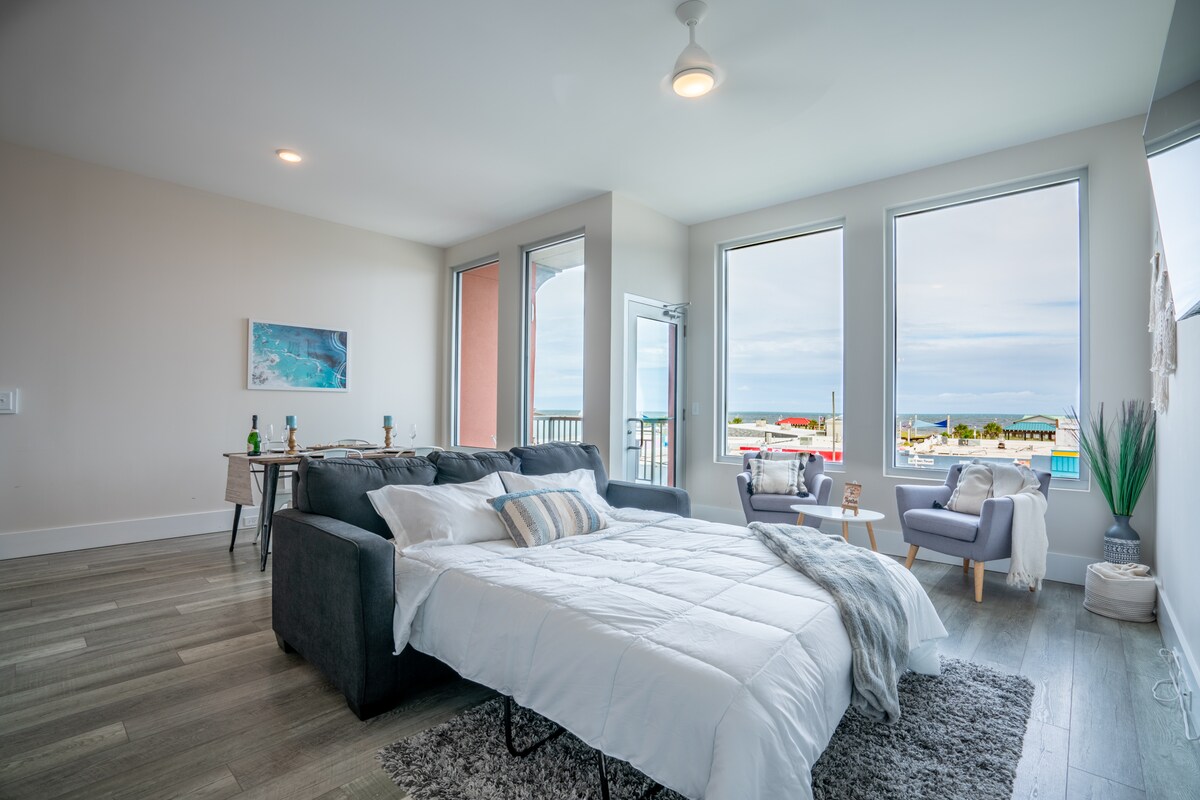 這間海濱頂層公寓位於卡羅萊納海灘木板步道上,是完美的海灘度假屋,提供真正優越的位置和設施豐富的住宿的獨特組合。步行即可抵達所有地方,設有電梯和泳池! 令人難以置信,180度的海灘和大西洋景觀,配有巨大的窗戶;您可以看到數英里。 令人驚嘆的日出和日落。從所有起居空間欣賞海景和碼頭/城市景觀。 夏天在陽台上觀看煙花。