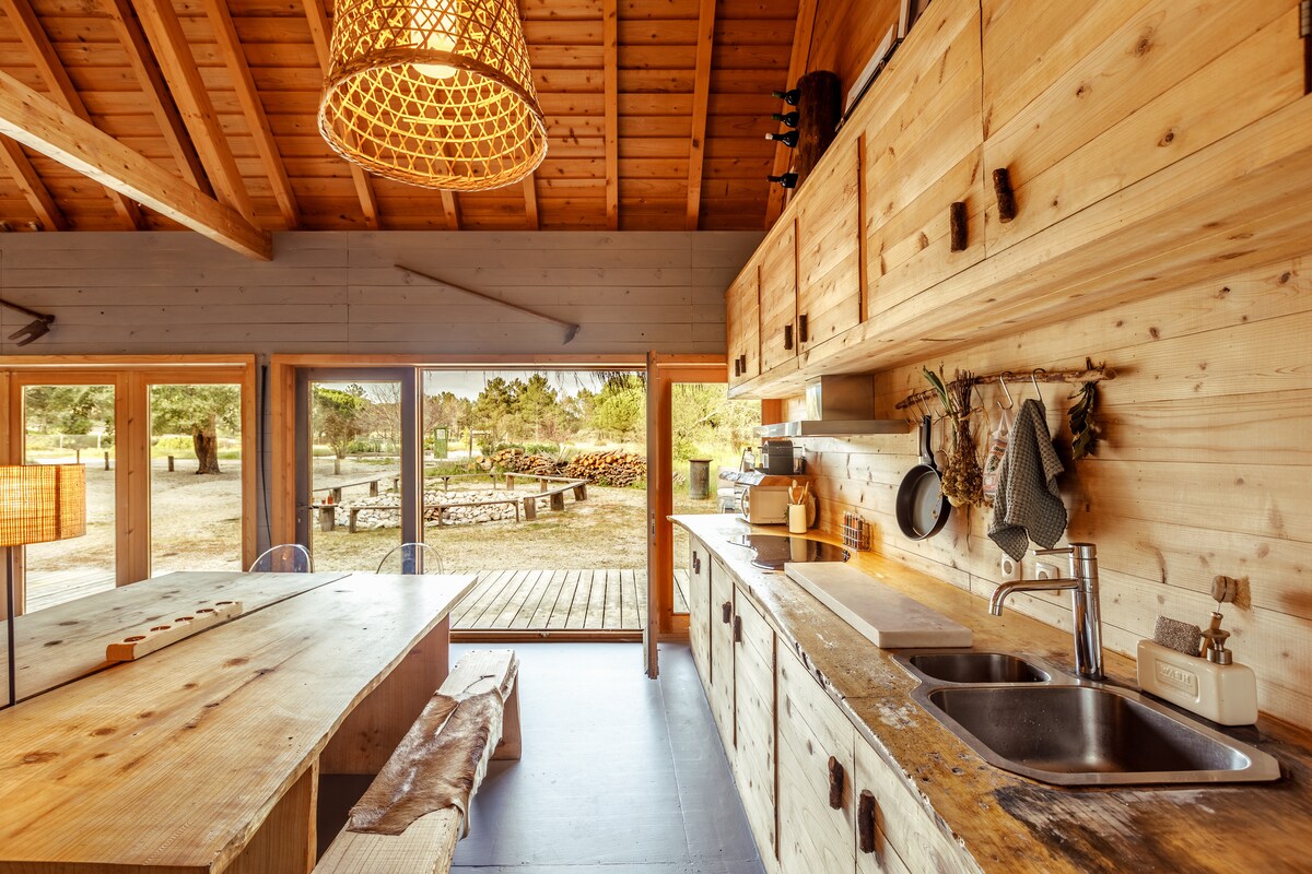A homestead estate in the forest of a vast nature reserve. Largest of three designer cabins, with panoramic window views of the wildlife. Fully equipped, with tailorable amenities & services, and on-call staff, to make your stay effortless. Enjoy the homestead fruit and veggies, and free roam fresh eggs. A 5min drive to Comporta village, and to white sand beaches, for some surfing and sea front horse riding. More than a getaway, an exhilarating, hands free, immersive experience!