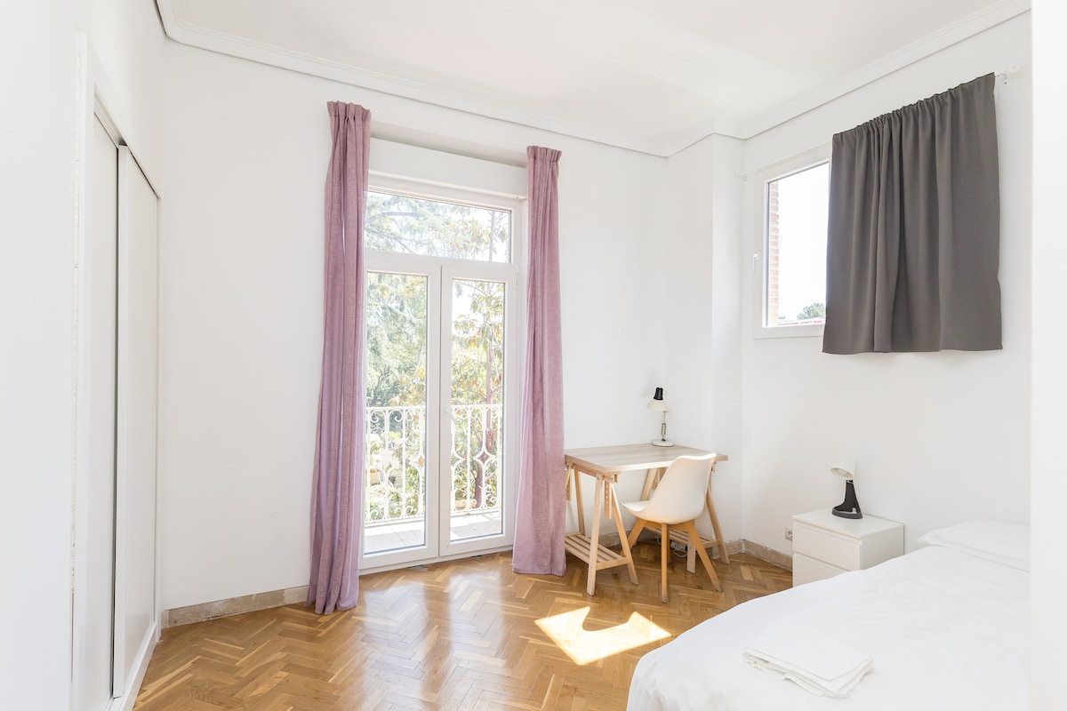 明亮的臥室,配有陽臺和花園景觀。 臥室位於19世紀房屋的一樓,新裝修的美式廚房和花園,您可以用鳥兒的聲音和石頭噴泉呼吸平靜。 這棟房子坐落在Colonia de Prensa的中心,這是Carabanchel的一個安靜的住宅區域。 在Calle General Ricardos的盡頭,有充滿裝飾藝術和現代主義參考的「偶像建築」。