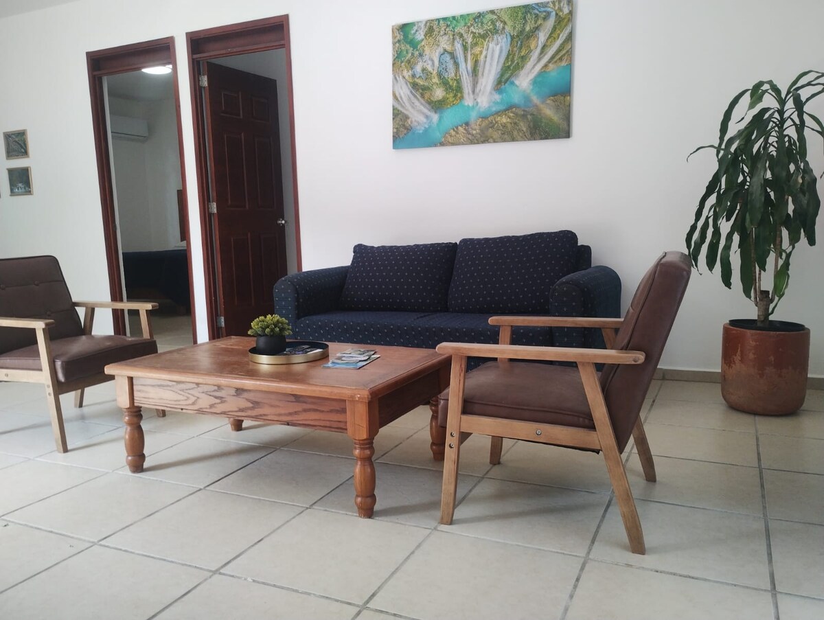 - 這是一個位於市中心的住宿,完全適應當地氣候且溫馨舒適,非常適合想要度過愉快時光並了解Huasteca Potosina美景的人。 - 步行即可抵達該地區的不同超市和通往各個旅遊景點的道路。 - 可容納兩輛車,無需支付停車費。 - 強化保護,確保 100% 安全。 - 距離巴士站僅幾公尺。