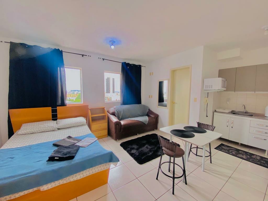 ⏳Tempo de leitura: apenas 30 segundos! Editado em 15/12/25: Com café 📌 Localizado apenas 50m da Avenida Brasil no Centro de Cascavel. Estúdio pequeno mas completo com cama, guarda roupa, pia, cooktop, geladeira, microondas, mesa com cadeiras, máquina de lavar, TV de 43 polegadas e ar condicionado.