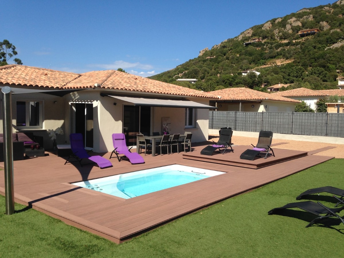 預訂時間為星期六至星期六。 新建別墅,坐落在韋基奧港灣南部的高地上。 私人溫水泳池、3 間空調房、免費 WiFi、烤肉架、面向港口和韋基奧港 (Porto-Vecchio) 的美麗海景。位於安靜的住宅區,主要的高級酒店都設在這裡。通過私人道路進出。