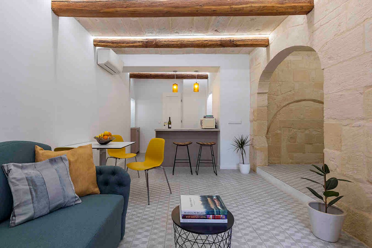 裝潢齊全的套房位於歷史悠久的首都馬爾塔( Valletta )。擁有300年歷史的傳統聯排屋風格與現代空間裝潢相結合,創造出無與倫比的氛圍。 他們位於卡斯蒂爾宮( Castille Palace )附近的一個角落,因此俯瞰著兩條迷人的瓦列塔街,因此光線充足。從4樓的露臺可欣賞大港的美景。