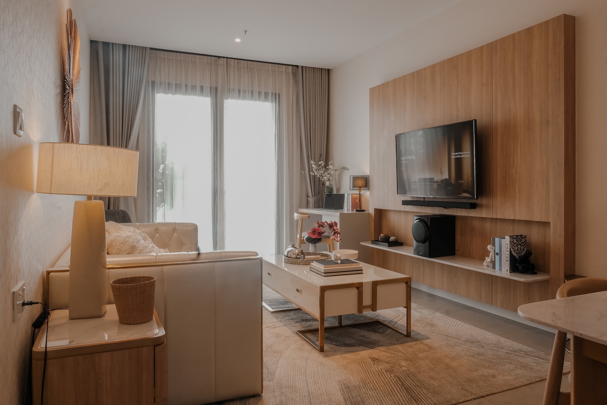 The apartment is beautifully designed in Wabi Sabi style located in D1Mension Residences building, District 1 apartment center, artistic style, high-class resort amenities, special rooftop swimming pool _ spa pool _ sauna room, gym_ showroom, private office, garden fish pond, 4' pizza right in the lobby, garden BBQ area, children's play area, spacious waiting room, All bedroom windows and balconies are airy, unique, luxurious, classy apartment