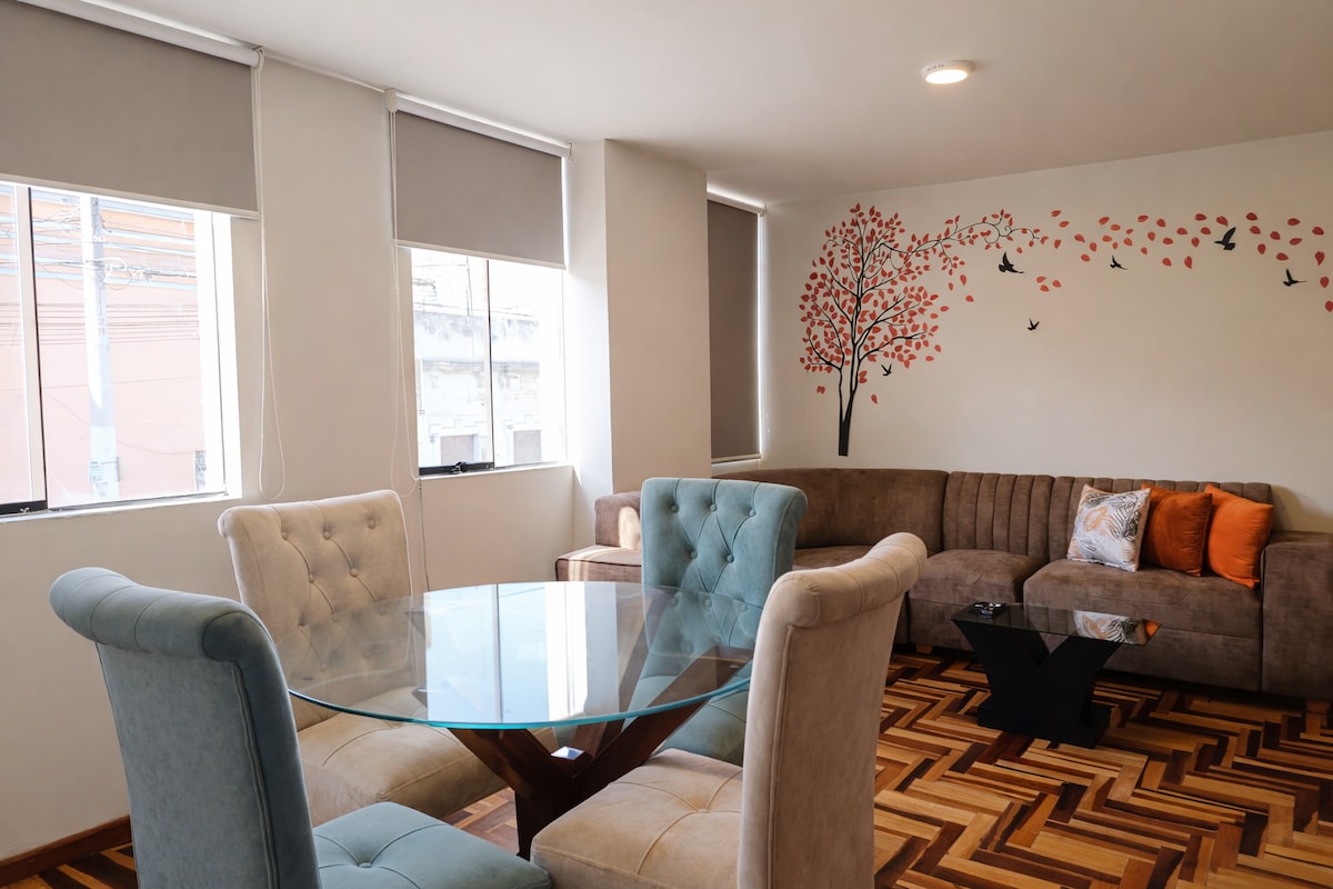 舒適的公寓,地理位置優越,位於阿雷基帕的歷史中心。 位於我的飯店三樓,但完全獨立,以保護您的隱私。 距離歷史地標、博物館、餐廳和所有必要服務僅幾步之遙。 這是一個安全的區域,可以四處走動,計程車很方便。 大樓提供私人停車位,可事先預訂。 我很樂意在您住宿期間提供建議。 歡迎你入住!
