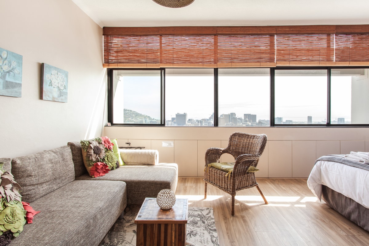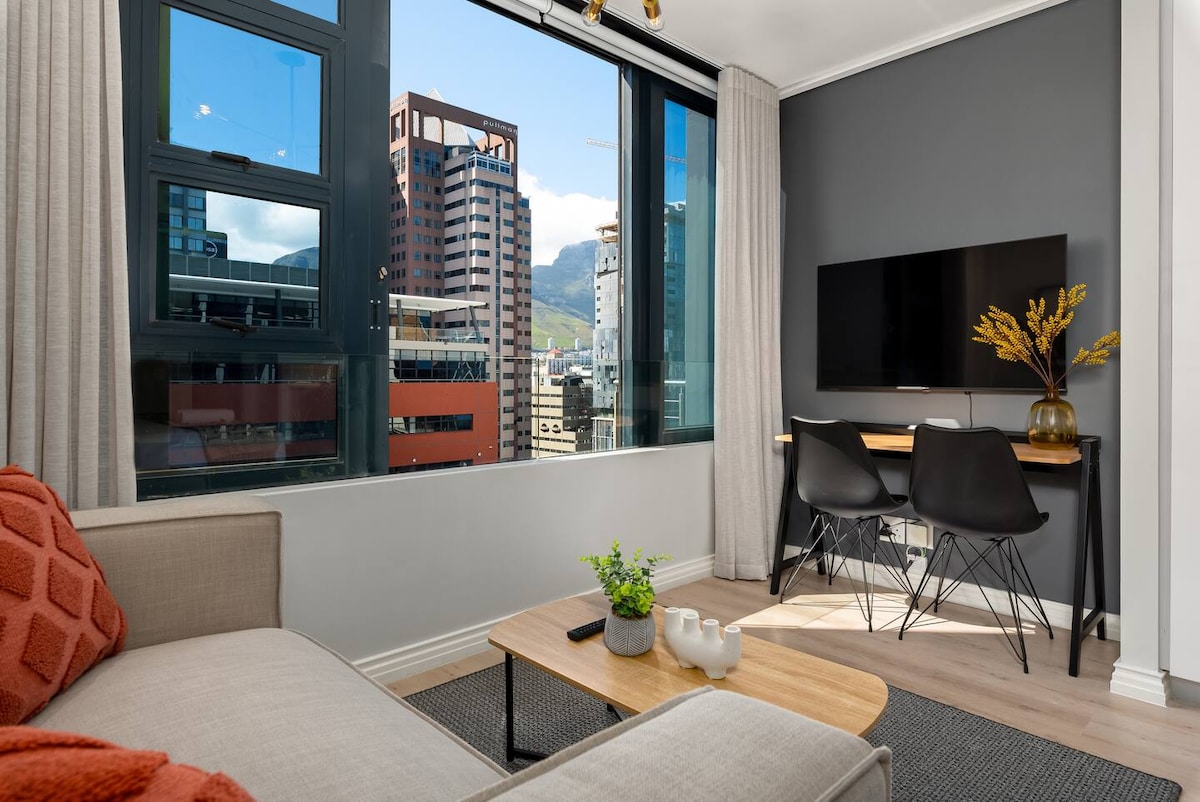 Located in the super convenient and safe Gardens Shopping Centre Apartment block, this newly renovated stylish studio has everything you need literally on your doorstep to enjoy Cape Town and surrounds. Located on the 12th floor and boasting a stunning view of the iconic Table Mountain, the space is perfect to relax after a day’s sightseeing or to work remotely with fast and reliable Wi-Fi. Free safe undercover parking can be arranged with unlimited paid parking for guests.