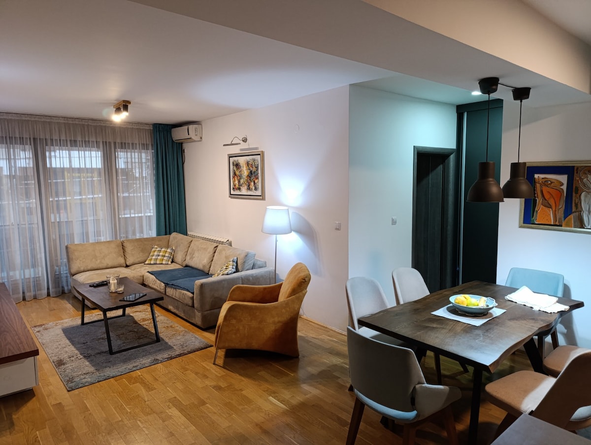 This beautiful brand new luxury penthouse apartment with terrace with situated 15min walking from central square, offers everything you need for spending some great time in Skopje. Private parking is free of charge. WI FI free of charge. Very close Super market, mall ....