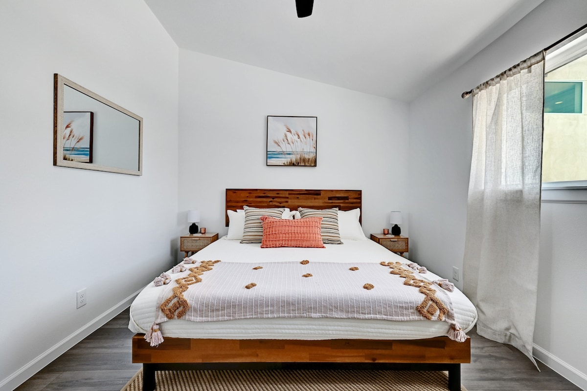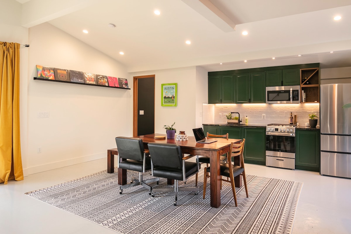 Stay in a private sunlit sanctuary next to a beautiful nature preserve while still minutes from Austin's best attractions. Enjoy the tranquility of well-appointed rooms with warm wood finishes and an expansive backyard deck for dining and lounging in the shade. Sleep soundly on the premium Casper California king bed and luxurious queen bed. Admire the backyard view from the sunlit oak sectional. Cook a memorable meal in the kitchen.