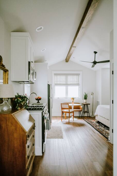 Welcome to Casita de Meador, a private 289 square foot guesthouse offering an elevated, easygoing stay in Austin. Rest well in a plush king bed with luxury linens. Cook or reheat favorites in a well-stocked kitchenette. Start your mornings with complimentary Nespresso coffee, tea, and treats. Settle in with ad-free streaming, fast Wi-Fi, a rainfall shower, unlimited hot water, and an in-unit washer and dryer. Well located for quick access to downtown Austin, UT, Q2 Stadium, ABIA, and the Domain.