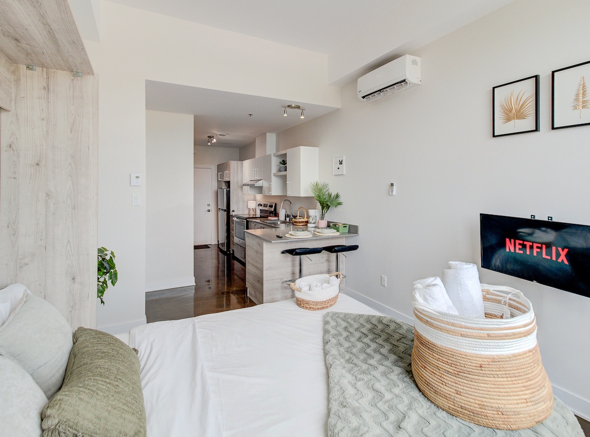 Enjoy your stay in the heart of the city ! Brand new TDC 2 downtown luxury with direct Bell Center access! Revel in comfort in our fully furnished and equipped one-bedroom condo with own private balcony! Your stay includes access to a sauna, pool, gym, skylounge, gaming room, lounge, and terrace with multiple barbecues. Free underground parking, with the subway just minutes away. Without stepping outside, the city is yours to explore. Plus, unwind with complimentary Netflix for the perfect stay