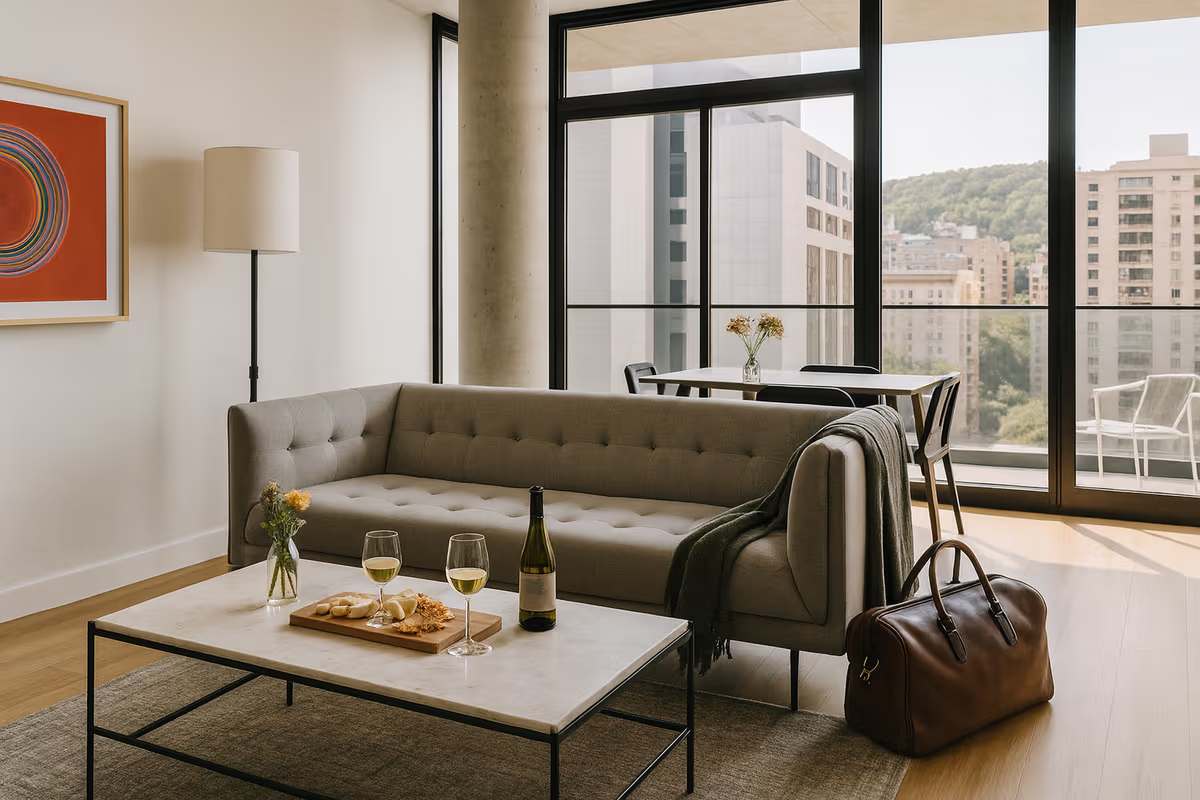 Indulge in refined city living from this exceptional upper-level 2-bedroom, 2-bathroom residence, ideally located in the very heart of downtown Montreal. Elevated high above the streets below, the apartment showcases spectacular panoramic views, elegant contemporary styling, and thoughtfully curated finishes throughout. Designed for discerning guests, it offers a seamless blend of sophistication and comfort, equally suited for executive stays and upscale urban getaways.