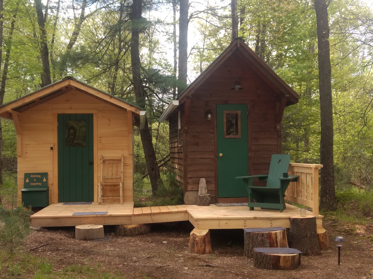 歡迎來到Hideaway Tiny House。這是一個定制建造的70平方英尺(內部7x10英尺)迷你屋。它坐落在松樹林的樹木之間。 HideAway Tiny House現在有自己的SleepAway小屋,配有標準雙人床,房價包含在內。 請查看相片。