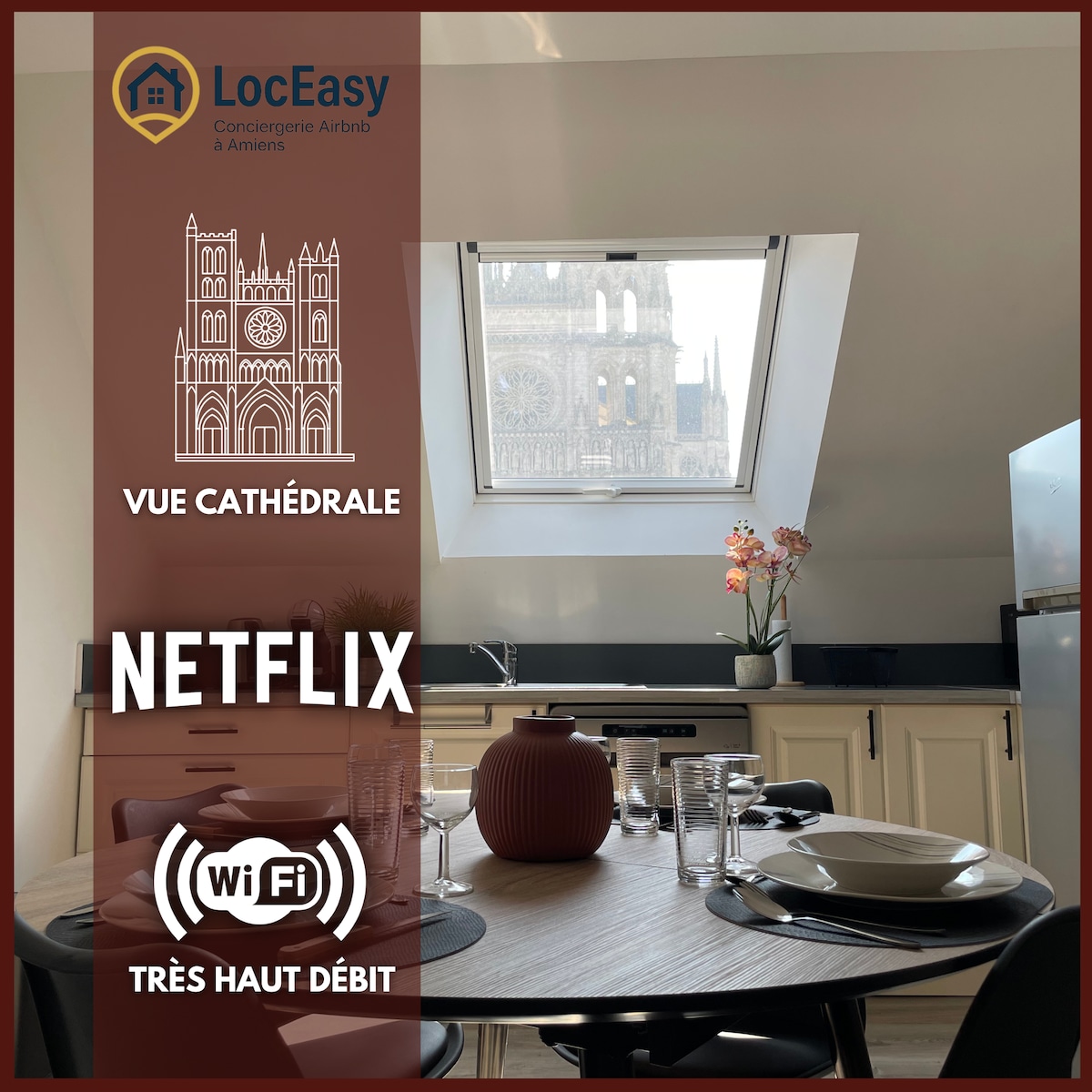 🏡 In the heart of Amiens, this new 48 m² apartment on the third floor offers a splendid view of the cathedral and the belfry. 📍 Ideally located next to the Halles du Beffroi, it is super well appointed and has all the amenities nearby. 🗺️ Take advantage of the hyper center to explore the city on foot and Netflix for your relaxing evenings. A comfortable and practical stay awaits you in this unique setting. 😊