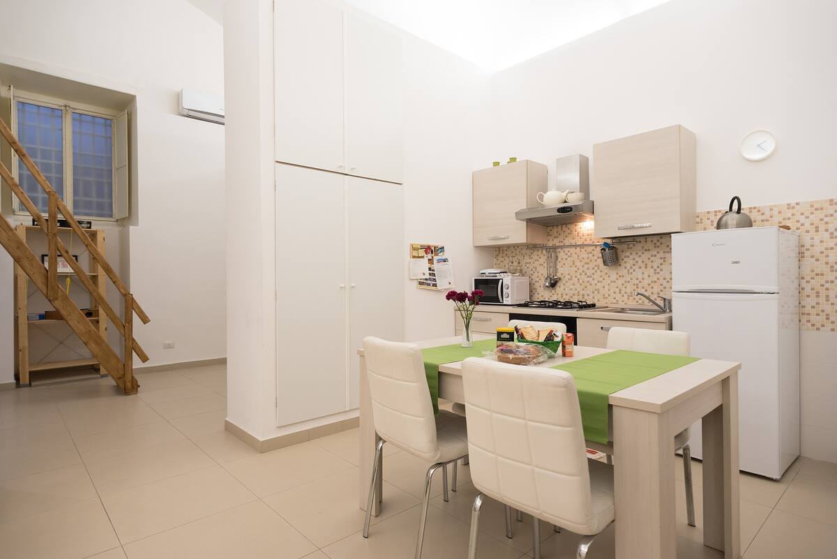 入住那不勒斯古城的魅力,距離歷史、藝術和民俗景點僅幾步之遙............ “ 位於歷史中心的核心地帶,擁有豐富的藝術和建築遺產,被聯合國教科文組織列為世界遺產。由於房子的地理位置優越,您可以步行到達真正的那不勒斯......就在您周圍...... “大教堂、德庫馬尼、地下那不勒斯、古老的教堂、披薩店、工匠和著名的聖 格雷戈里奧·阿爾梅諾(耶穌誕生街和牧羊人街)都在幾步之遙。位於一座十七世紀建築的二樓,房間經過精心翻新,讓客人住得舒適和溫馨。地鐵、機場、火車站、港口和高速公路都很方便。 這座浪漫的房子採用優雅的酒紅色裝飾,最多可容納四人。它由一個可愛的大客廳、法式沙發床和設備齊全的廚房用餐區組成。閣樓上有一張雙人床和一間帶淋浴的浴室。公寓配備了各種舒適設施、電視、無線網路、獨立暖氣和空調。