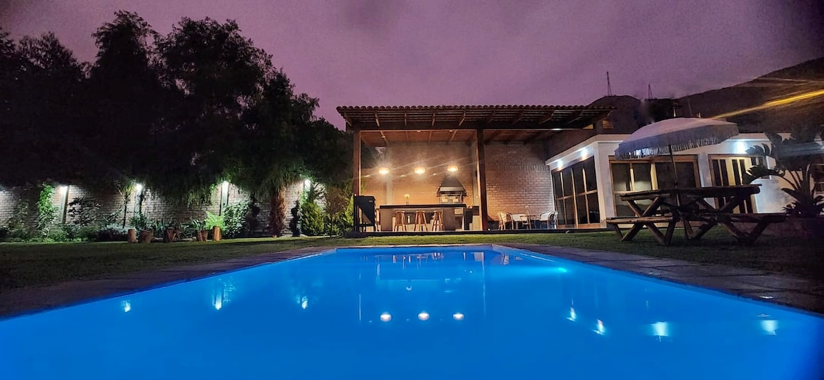 入住:上午 9 點(彈性) 退房時間:上午 11 點 可容納 8 人的私人鄉村別墅。 全年陽光充足!! 游泳池、花園、壁爐、果樹區、烤肉區(烤架、中國盒子、木材廚房、泥爐)、營火和兩個停車位。 設備齊全的廚房、WiFi/有線電視、2 臺電視。 地理位置優越,與盧林河 (Rio Lurin) 平行。
