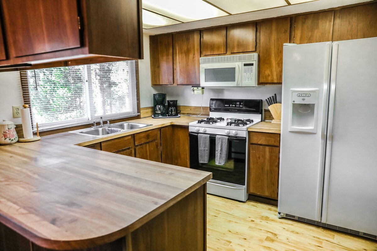這個舒適的小屋有三間舒適的臥室、一間浴室、洗衣機/烘乾機和設備齊全的廚房。 開放式平面圖、拱形天花板和大餐桌讓這間小屋成為您的家人或團體的寬敞選擇。 步行5分鐘即可抵達市中心,那裡有很多很棒的餐廳、商店和社區活動。 庭院管理員就住在街對面,可以協助處理可能出現的任何住宿需求或任何當地活動的旅遊建議。