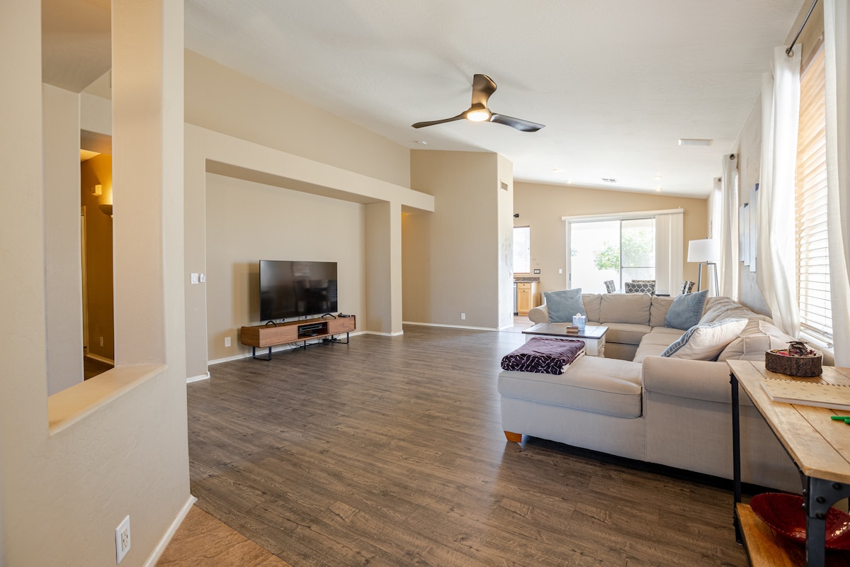 重新改造的Chandler房源,距離美麗的Chandler市中心僅幾分鐘路程,距離所有景點(水上公園、美食、斯科茨代爾、春季訓練、高爾夫、商場、購物、賭場和醫院)都很近。 包括新家具、新電器和度假村風格的後院(有蓋露臺、瓦斯壁爐和可付費加熱的閃亮泳池)。有2張桌子可供在家工作。 適合全家人入住的寬敞空間! TPT 編號 21499694/COC 編號 304924