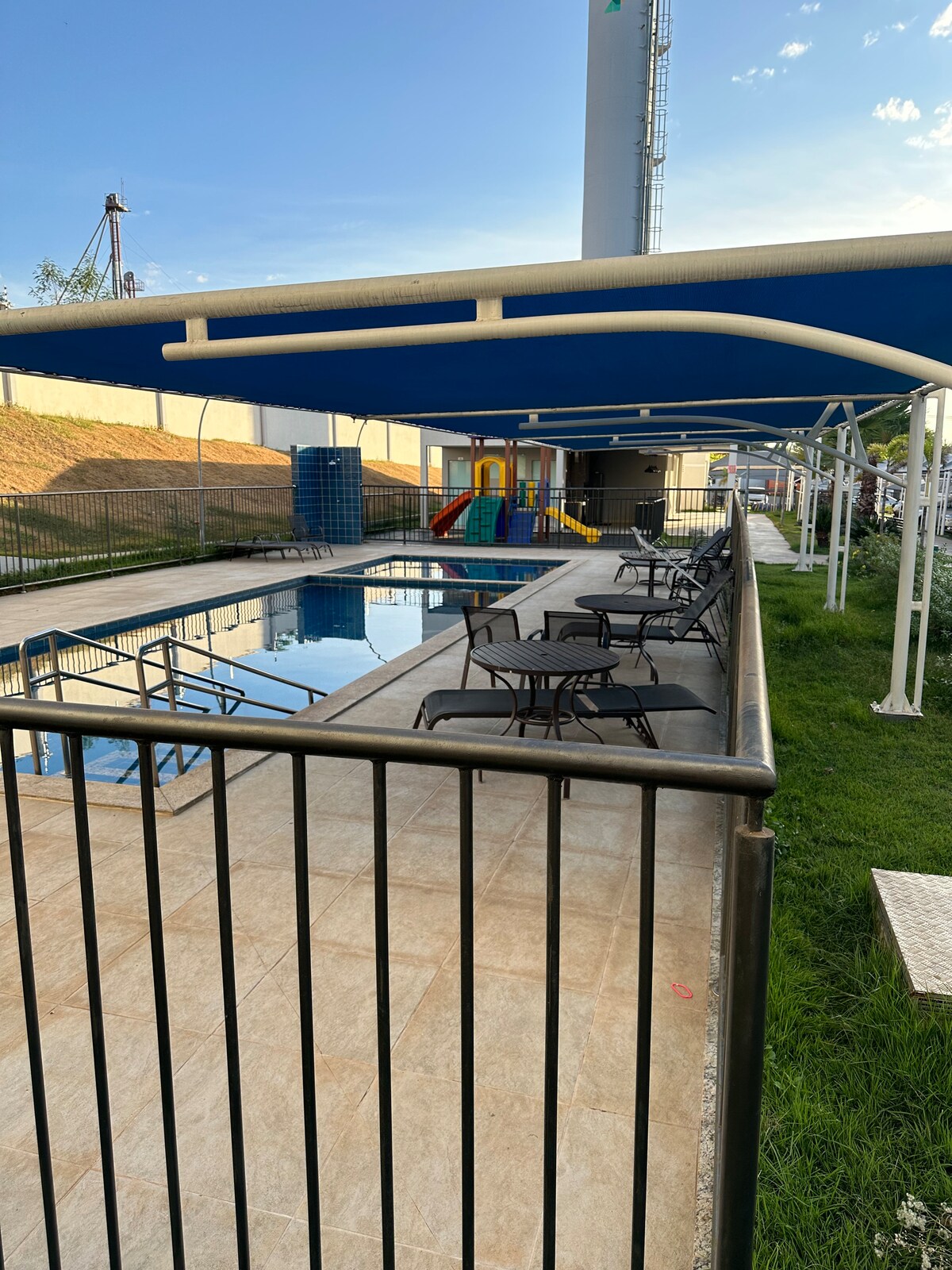 配備太陽能暖氣的溫水泳池。 在這個時尚的地方與全家人一起享受樂趣。 平坦舒適的工業風格,配有加熱(小型)泳池和烤肉架。 注意:泳池有太陽能加熱器。 在雨天或霧天,暖氣可能會減少。 位於住宅區,距離Chapada dos Guimarães-MT中心僅5分鐘(開車)。 我們有免費私人停車位,可供停放1輛車。