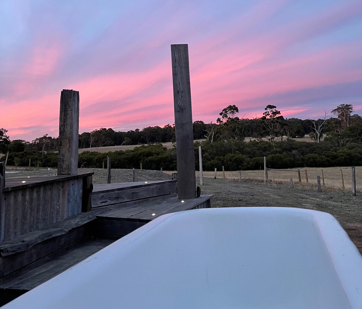 This place is pretty special! A lovingly restored school bus now spends its time nestled amongst gum trees. You'll soak up the warmth of the morning sun, whilst listening to the bird life, and watching sheep, cows and kangaroos in neighbouring paddocks. The privacy and tranquility will allow you make yourselves at home. Whether you’re reading in a hammock, drinking wine watching the sunset, soaking in a spa, playing boardgames, or cooking on the Weber. Not suitable for children or pets.