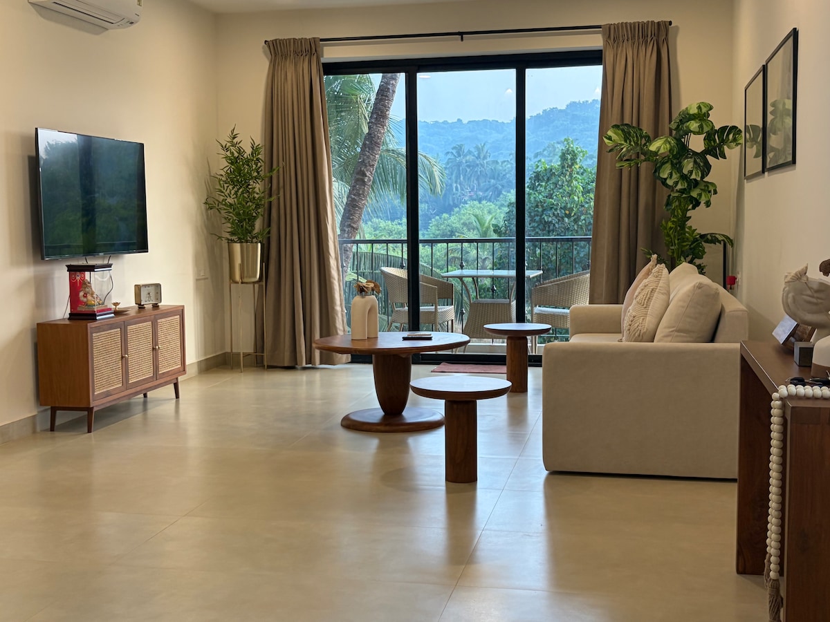 Sol do Mar – A Premium Nature Retreat in the Heart of Siolim, Goa 1BHK villa features a comfortable bedroom with AC, a spacious living area with AC and a balcony overlooking lush greenery, and a fully functional kitchen. The verandah with a jula (swing) and the garden provide idyllic spots to soak in palm tree views. Amenities include WiFi, TV, water purifier, toiletries, and free parking. Just 15 minutes away from Goa’s famous beaches—Morjim, Vagator, and Anjuna.