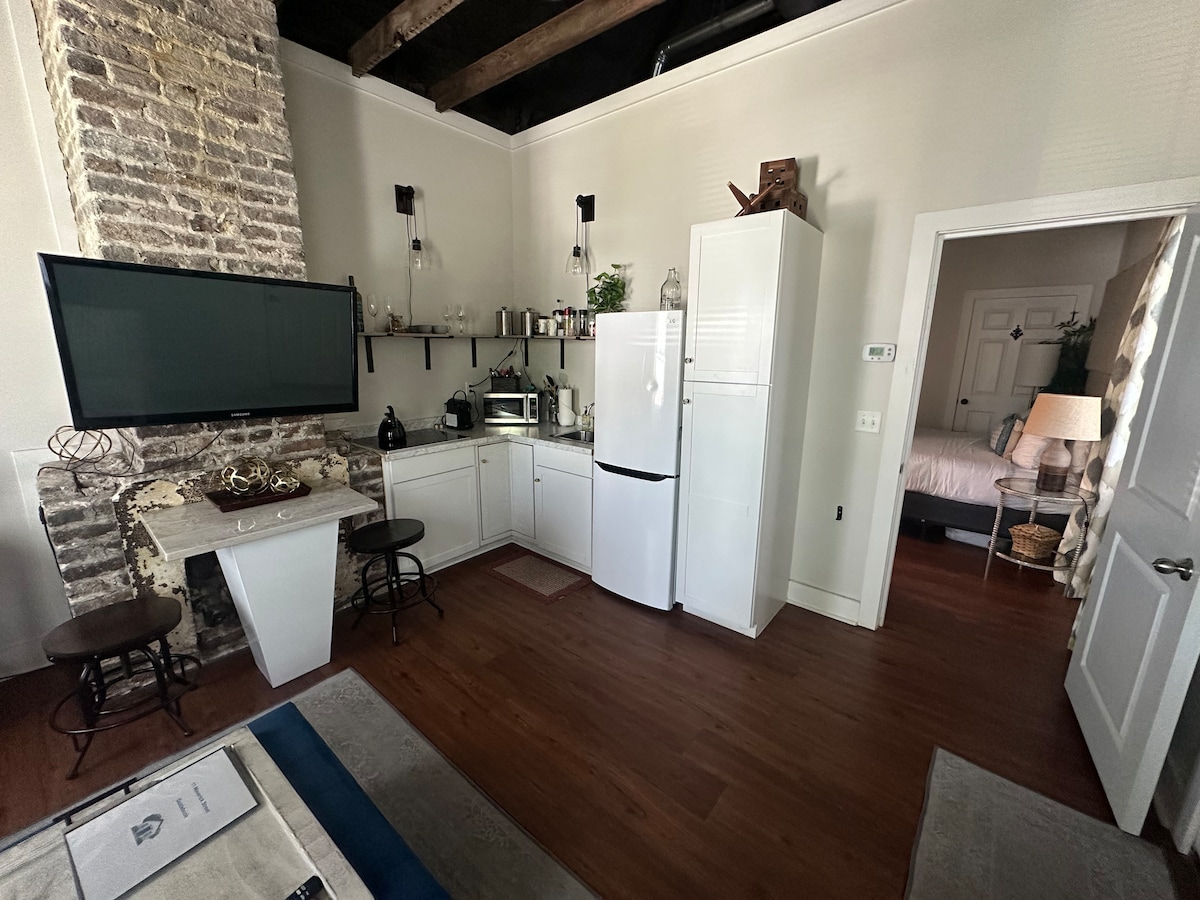 放鬆身心,享受靠近查爾斯頓市中心和Folly海灘。二樓馬車房,配有小廚房,配有微波爐、Keurig、飲料冰箱和水槽。非常適合情侶、獨行者和商務差旅人士入住。靠近Harris Teeter/星巴克、Highfalutin Coffee Roasters和Odessey Bottle Shop。安靜的空間,包括免費停車位。
