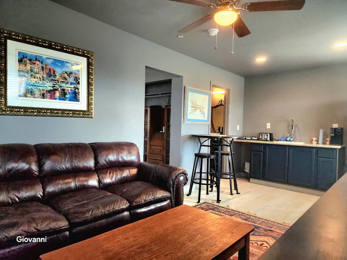 這間獨立單間公寓位於1英畝房源的後院。配備WiFi、咖啡機、迷你冰箱、微波爐、專用工作空間、智慧電視、烤肉區、狗狗遊戲區、露營車停車位、帶步入式淋浴間的浴室和舒適的雙人床。 位於拉斯維加斯以西約60英里,距離死亡谷45分鐘,位於莫哈韋沙漠和雄偉的春山之間,為遊客提供豐富的戶外探險。