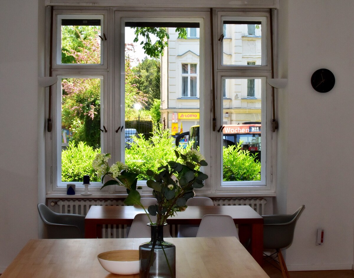 中央、陽光充足、有空調的閣樓公寓(70 平方公尺),配有舒適的全套廚房,您可以在這裡享用美味的早餐,開始新的一天。舒適的床讓您睡個好覺。 享受 9 平方公尺的綠色露臺(這裡允許吸煙),欣賞無阻礙的景觀。距離公寓不遠的地方有 S-Bahn Stadion JuliusLeberBrücke,從那裡只需 3 站即可抵達波茨坦廣場 + 勃蘭登堡門 + 政府區。Wi-Fi