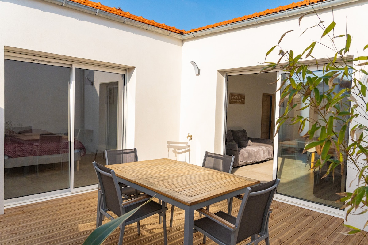 全新翻修的迷人小屋。 15 平方公尺的舒適露台,讓您可以在陽光下放鬆身心 一個美麗的客廳,配有設備齊全的廚房。 一間配有更衣室的臥室,配有 Emma 140*200 床墊,一間帶馬桶的浴室。 我們希望這種現代風格的設計能為您帶來最佳的舒適感。 步行 5 分鐘即可抵達海灘,步行 8 分鐘即可抵達沙泰萊永市中心及其市集,享受絕對的寧靜。 快速前往拉羅謝爾(La Rochelle)/雷島(île de ré)和奧萊龍島(Oléron)/博亞德島(Boyard)