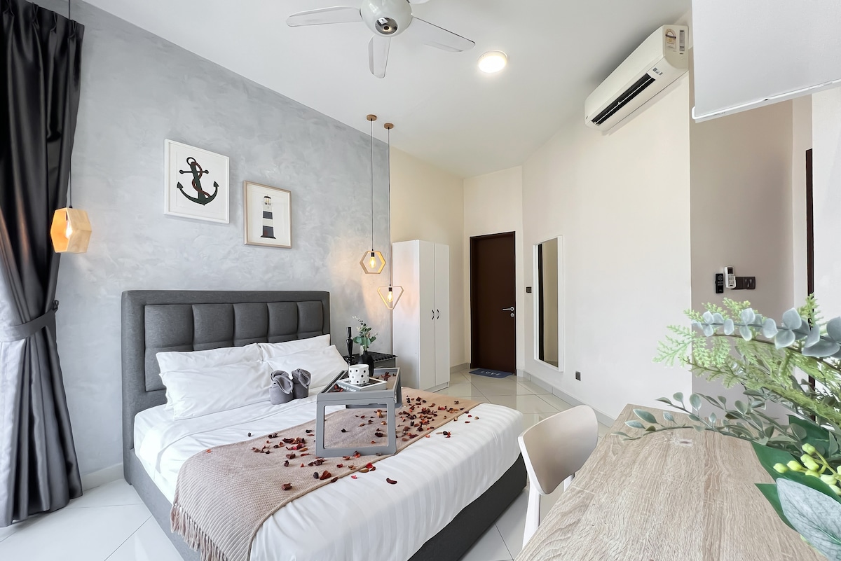 📍Pertama Residency Welcome to Grey City! This studio is newly set up with lots of love, combines contemporary decor with modern amenities and an experience all can enjoy especially Jacuzzi moment with your love & 100” projector screen w/Netflix. This unique place has a style all its own, it offers a cozy, clean, quiet & refreshing stay environment for couples. Come and experience in the Grey City! See you.