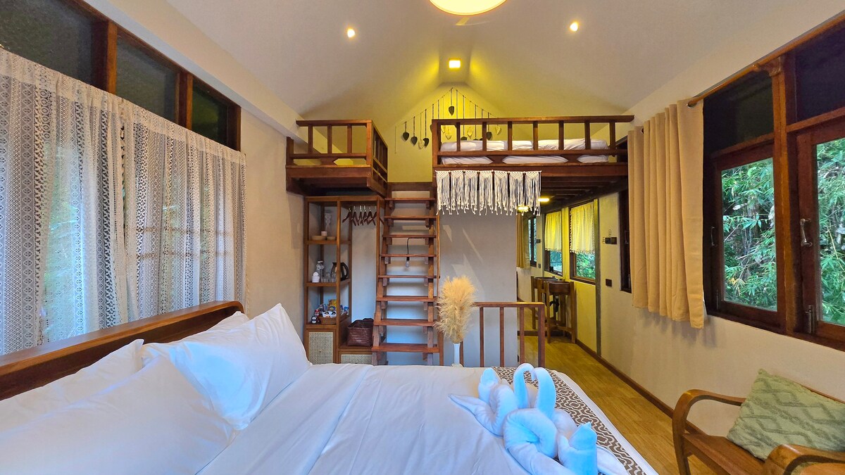 Nestled in the small village of Mea Na, in the green hills of Chiang Dao, the Baan Len room offers a warm atmosphere thanks to its natural wood design. This charming room consists of a comfortable main area, with a mezzanine equipped with a bed that can accommodate two children. On the ground floor is a patio, perfect for enjoying the fresh mountain air in the evening. Free parking right next to the bedroom entrance.
