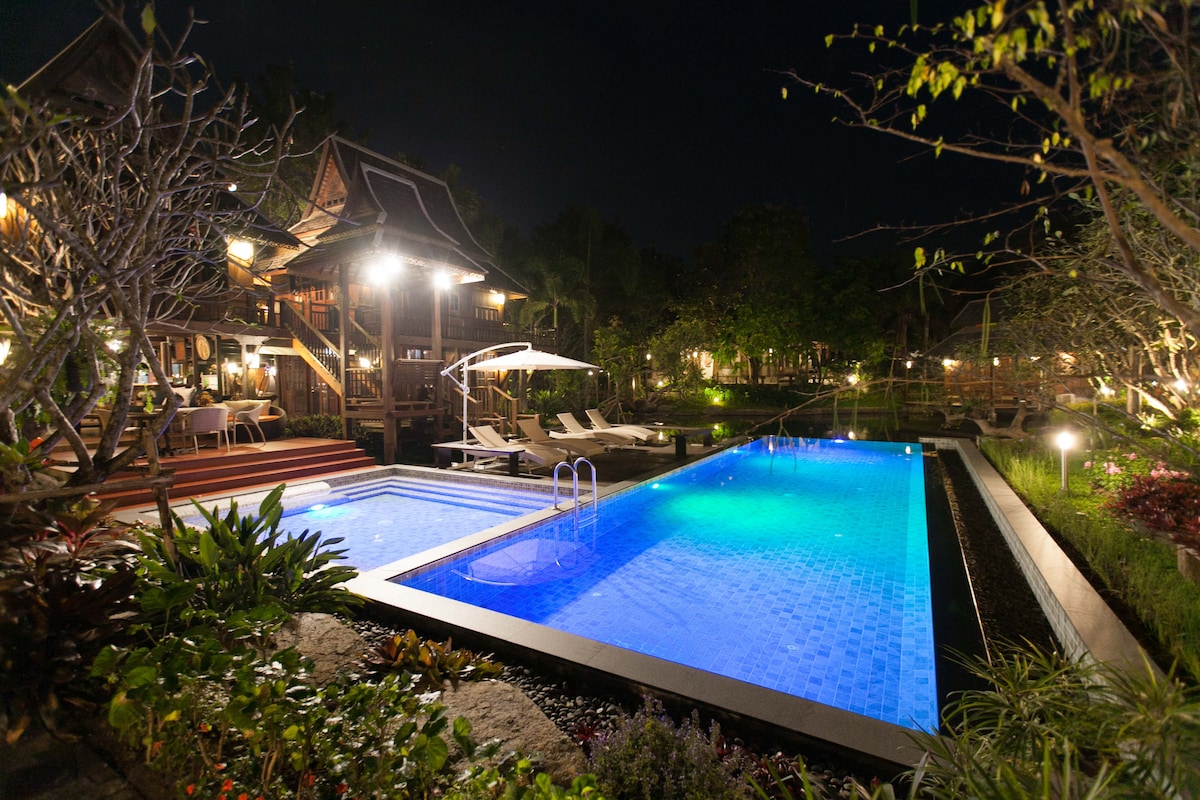 Suwarnburi House , a unique Thai authentic style home set in a verdant and floral atmosphere. The house has altogether five seperate rooms which two are fitted as a twin room and the other three as double rooms (every room has an ensuite bathroom). There is an out door pool and a hot tub, a beautifully decorated dining room and various seating areas within the premises.