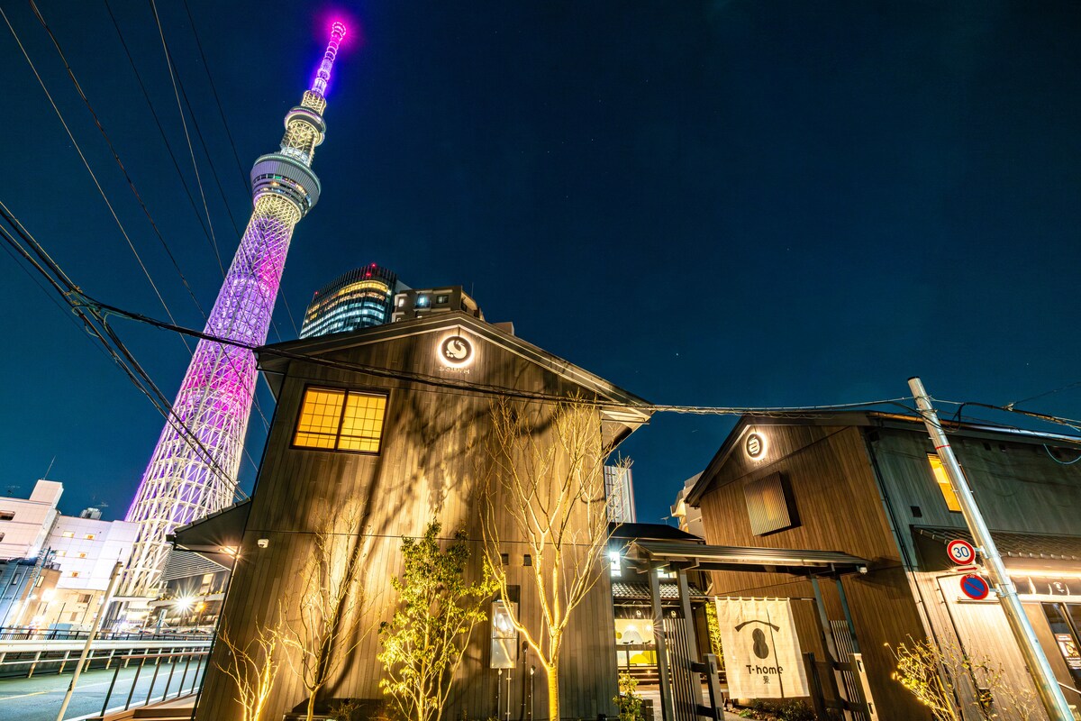 【新筑】晴空塔步行1分钟!再现江户长屋风情“T-home 景” 距离东京晴空塔旁的押上站步行仅需1分钟。 5栋以江户长屋为灵感的木造建筑,营造出融合现代与传统的下町风情。 ☆ 大家庭与团队旅行的首选!全29间房,最多可容纳200人同时入住。 ☆ 像在家一样生活。室内配备厨房、冰箱、微波炉及洗衣机。 ☆ 所有家具家电均为全新,在和式氛围中享受舒适的长短期住宿。 ☆ 深度体验当地文化。设施内设有餐厅与开放空间,将举办感受日本四季的活动。