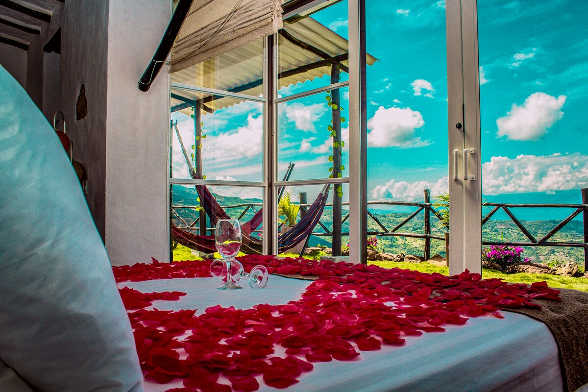 舒適的小屋,適合兩人度假,有一間臥室、帶熱水的獨立浴室、咖啡區和冰箱、私人停車場和一個火坑,適合營火之夜和特殊時刻。 步行五分鐘即可抵達拉羅卡 (La Roca) 避難所,開車 15 分鐘即可抵達聖徒之桌 (La Mesa De Los Santos)。周圍有許多非常適合生態徒步旅行或騎自行車的路線,據說這些路線是解放者曾經走過的真實路徑。完美的自然環境。