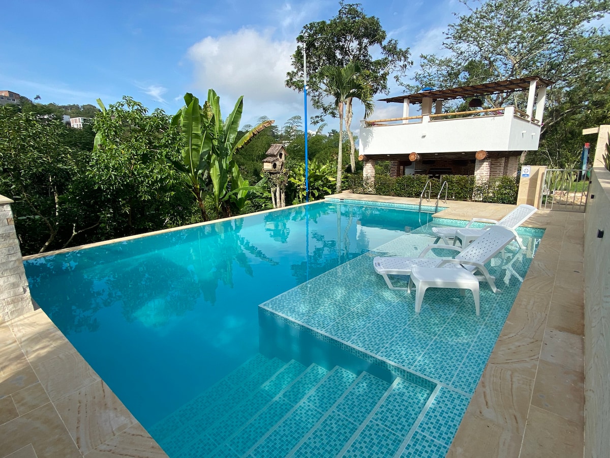 Relájate y disfruta en esta finca ideal para el descanso, conectarse con la naturaleza y desconectarse de la ciudad. Ruitoque tiene el mejor clima, en el día disfruta de la piscina con su cascada, de la naturaleza, los árboles, las flores, caminar por un sendero ecológico, ver y escuchar aves, descansar en la malla o en las hamacas, meditar alrededor de una ceiba frente al gudual, disfrutar del sonido de una quebrada. En la noche, puedes contemplar el atardecer y disfrutar de una fogata.