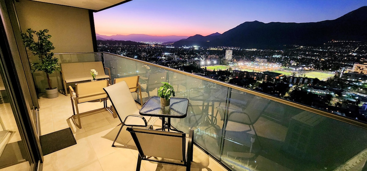 獨家公寓,可俯瞰安第斯山脈和曼克山脈的全景。 位於拉斯孔德斯最好的街區,安靜且安全,距離P. Arauco Mall、Parque Araucano、Metro Manquehue和各種餐廳、咖啡廳和夜生活僅幾步之遙。 非常適合休息或工作,交通非常便利:20分鐘機場,45分鐘滑雪和葡萄園中心,90分鐘海灘。 除了溫水和戶外泳池、桑拿房、健身房、quinchos、電影院等。