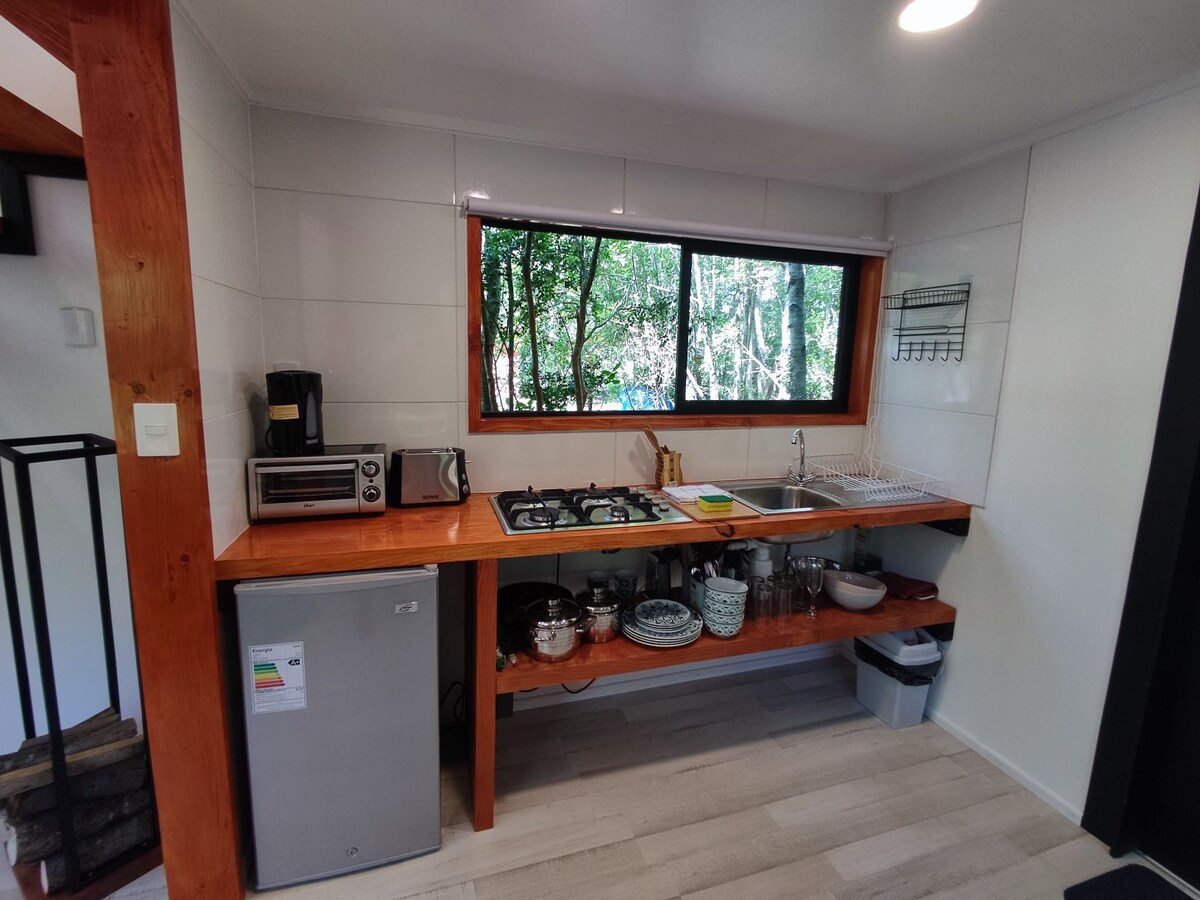 小房子可供兩人入住,位於泻湖前面,四周被原生森林包圍,距離蒙特港僅40分鐘路程,距離El Tepual機場僅30分鐘路程。 非常適合交通便利的度假勝地。 配有雙人床、暖氣、獨立衛浴和設備齊全的廚房,配有爐台、小型電烤箱和餐具。 設計實用、舒適和明亮。 房客可以享用帶燒烤架的營火、皮艇和按摩浴缸,需在現場支付額外費用。