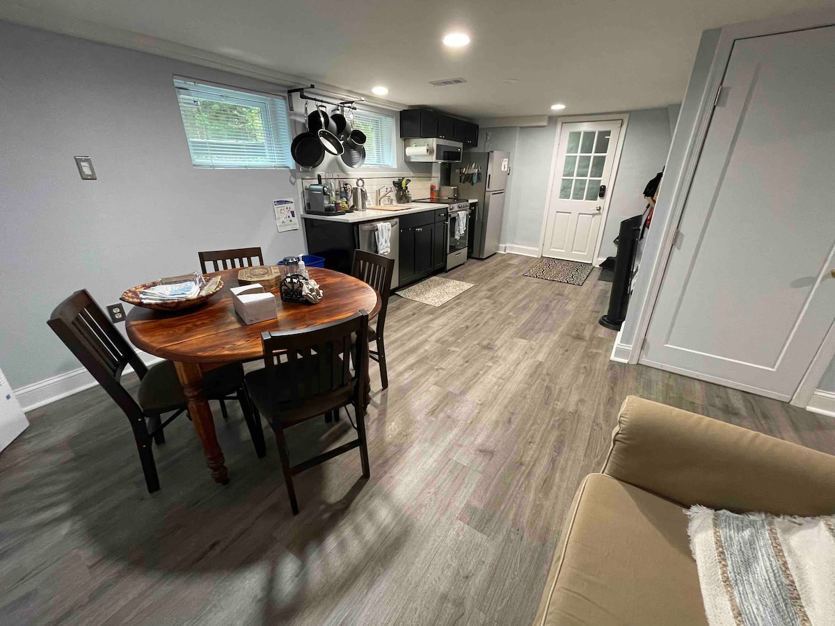 陽光充足、安靜的地下室公寓,面積約500平方英尺,有獨立入口。我們住在樓上,但入住後,您將享有隱私。公寓距離馬里蘭大學約1.3英里,距離華盛頓特區7英里,步行即可抵達地鐵和其他公共交通工具。 距離購物、餐廳、環城公路和戶外娛樂設施僅幾分鐘路程。房客可以使用帶桌椅的露臺和大後院,在好天氣下坐下享受。