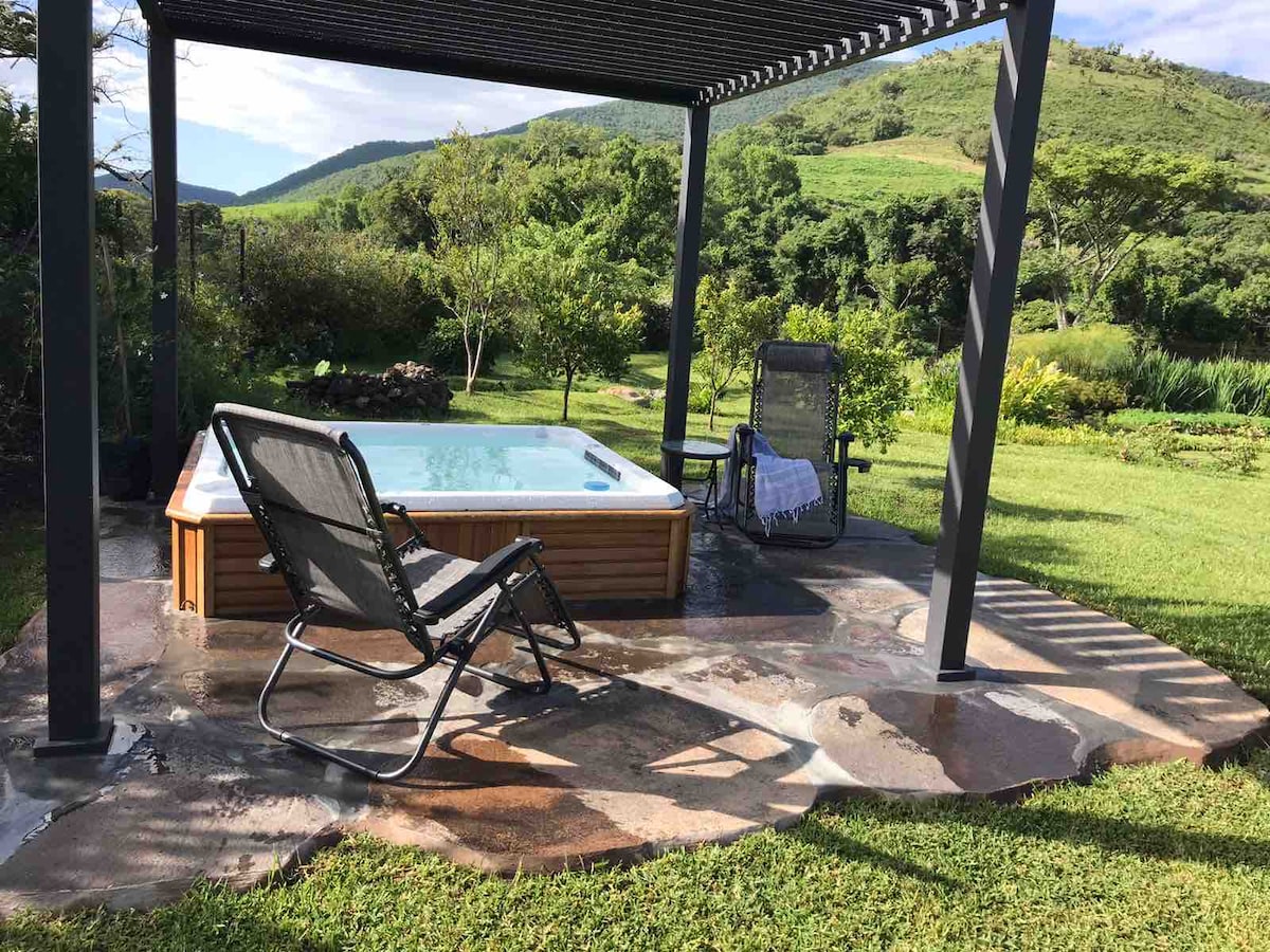 Delicious Whisper Garden house! Magnificent and surrounded by nature. The property has 3,500 m2 with charming corners, jacuzzi for 5 and the bio-pool is fabulous! Just 15 minutes from Malinalco downtown. Stay in 2 spacious bedrooms each with its own bathroom and terrace, for 7 people. Well equipped kitchen, dining room with fresh heights and an amazing view. Free covered parking, fast wi-fi, mini-maid's room with bathroom. Guests feel so good in Whisper Garden that they don't want to go out!