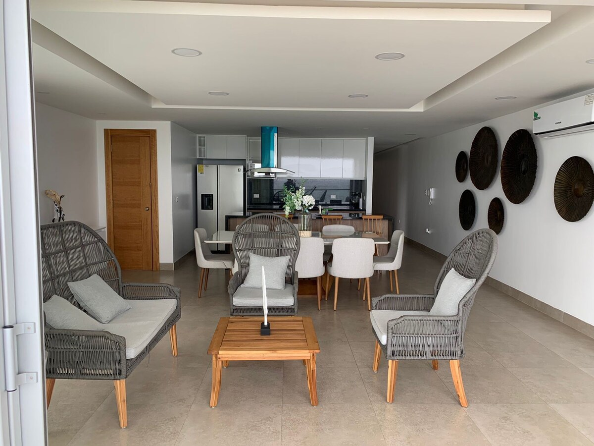 距離la Chocolatera入口一個街區,距離「punta pacifico」塔樓一個街區,在Salinas-Chipipe有海景,有半島最美麗的海灘。家具齊全,客廳和臥室有空調、WiFi和智慧電視。公寓配有立式槳板、衝浪板(長板)和帶手套的拳擊袋。 公寓位於頂樓(4樓),沒有電梯。