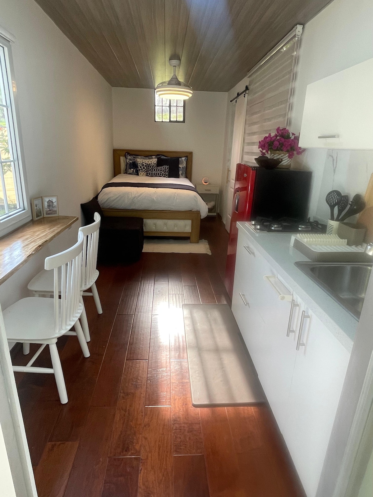 Si te gustan las aventuras al aire libre y buscas una estadía distinta, tenemos el espacio familiar que necesitas. Te sentirás en medio de la naturaleza, pero a la vez estarás cerca de todo en una pintoresca cabañita tipo A, con balcón, internet, aplicaciones de streaming, cocina amplia, lavadora y agua caliente.