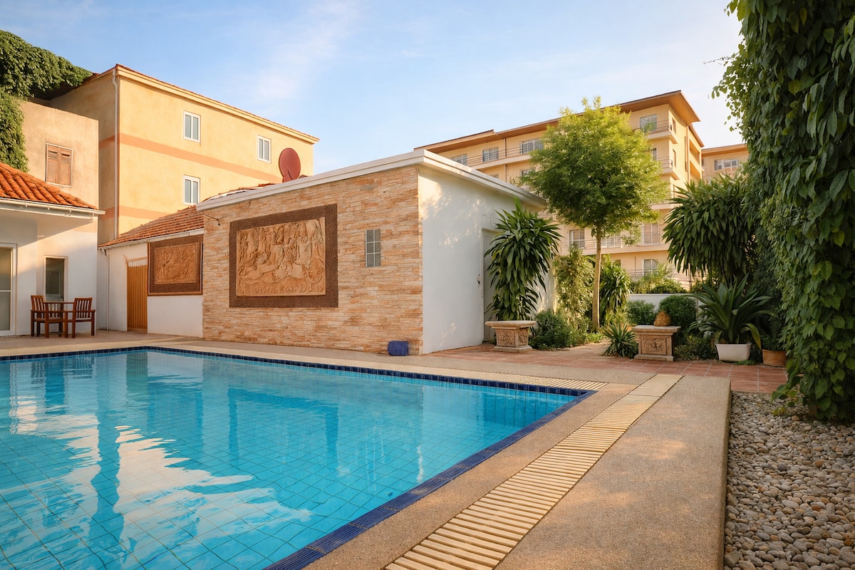 位於芭達雅海灘中心的獨立別墅,融合了都市便利性和度假村風格的寧靜。 摘要 •步行即可抵達海灘、購物中心和娛樂區 •位於市中心的安靜獨立別墅,交通便利,不是只能舉辦派對的房源 • 556 平方公尺室內起居空間 + 200 平方公尺私人露臺 • 雙層高天花板設計(4.2 公尺/3.3 公尺) • 管家服務、日常客房清潔和毛巾更換
