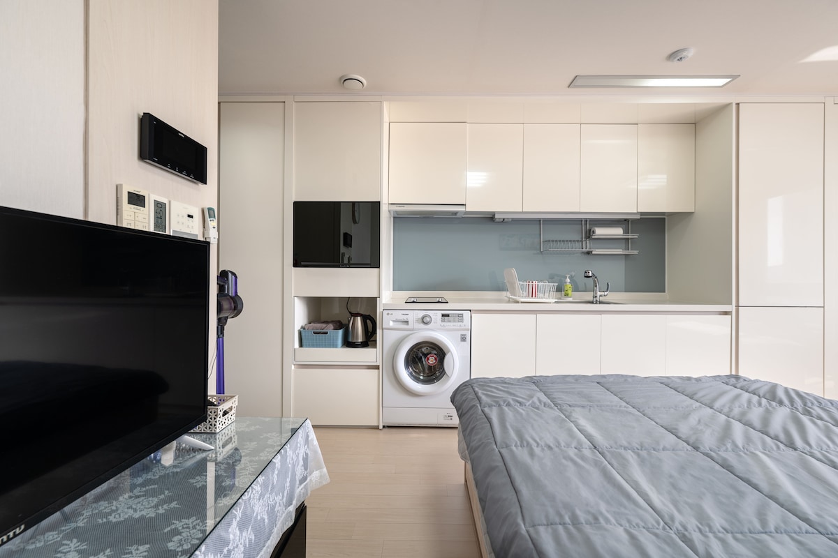 房源❣️乾淨整潔,設備齊全,可供短期或長期舒適入住。 周圍環境安靜,陽光很好,所以房子很明亮。房間還有一個私人露臺,屋頂有一個公共露臺。 這是一張超級單人床,讓您能夠寬敞舒適地入住。👍 毛巾/髮用品/身體用品/洗手液/餐具/一切都有。 🥰房客住得舒適是我的幸福~♡ 戶外露臺上還有一張桌子,您可以在那裡放鬆身心,因此最好使用。 附近有便利商店、超市、傳統市場、美食、圖書館、巴士站、地鐵等。👍👍 仁川機場直達豪華轎車(松潭城際巴士站) 下車後步行5分鐘即可抵達住宿~♡