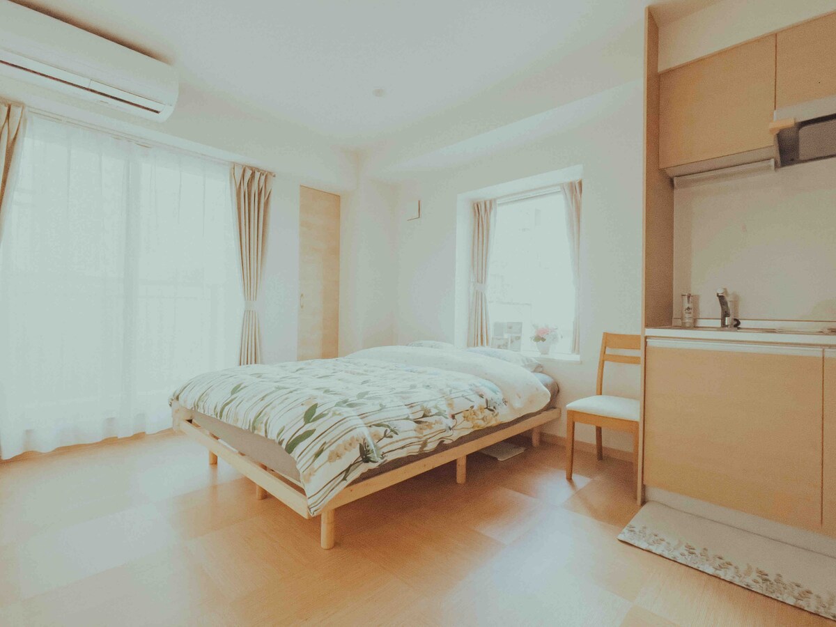 【Japan 8】2号房源 和风雅居•现代日式 这套客房距离天下茶屋(Tengachaya)地铁站步行5分钟,有南海线和堺筋线两大主要地铁线路,可轻松前往难波商圈、天王寺商圈、日本桥商圈、梅田商圈和关西机场等任何景点,是大型的交通枢纽站。 天下茶屋地铁站旁有购物中心,2家大型超市,连锁药妆店。 有很多美味的早餐店:著名的Mister Donut甜甜圈店,连锁View De France面包店,McDonald's和KFC。 日本连锁套餐店YAYOI 、乌冬面馆、中餐馆,“一斗”烧肉店,人气寿司“くら寿司”、Big Boy 牛排馆等多家餐饮店和居酒屋;商店街。多家便利店(711、罗森、全家)等供您选择。 交通和生活非常便利。 这套2号房源位于2楼(没有电梯)。 • 日式与现代融合的沉静氛围 • 榻榻米风区 + 双卧室,非常适合家庭 • 脚踩榻榻米的触感、木制和纸的温度 • 低饱和的灯光让时间变得慢慢而温柔 • 适合读一本书、写日记、发呆、睡个长觉 外面是旅行,这里是心的休息站。