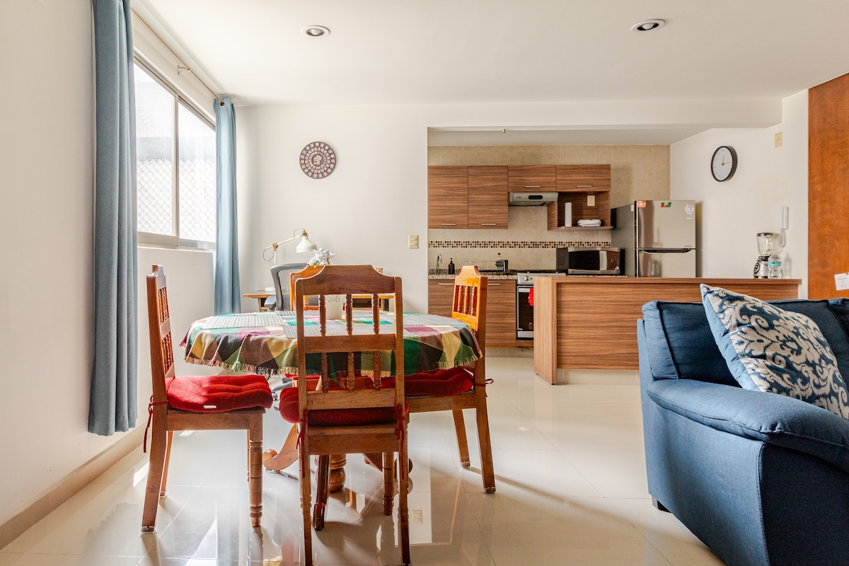 美麗的豪華公寓,距離科約阿坎的藝術中心弗裏達·卡羅博物館兩個街區。 它有兩間臥室,配有特大牀和雙人牀。 全功能浴室,四人客廳,設備齊全的廚房,餐廳和私人露臺。 配有50 mbs網路。 靠近Frida Kahlo博物館、Viveros de Coyoacán、工藝市場、Coyoacán教堂、國家Cineteca教堂、國家Cineteca以及商店和餐廳數量。