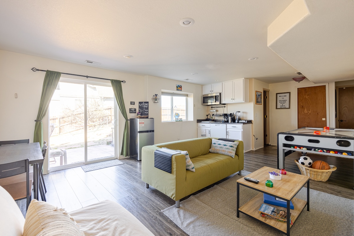 舒適的住宿公寓,非常適合只有一兩位房客打包:大型淋浴間、壁爐、唱片播放器、Roku電視( Hulu/Netflix )和最舒適的牀! ★步行前往OTC ;短途車程Dwntwn、CC、Pikes Peak、USAFA、UCCS ★院子:熱水浴缸、火坑、烤架、揚聲器、庭院遊、Schwinn自行車 ★健身房: Peloton、Treadmill & Elliptical。跳繩、水壺鐘、揚聲器、Roku電視等! ★辦公桌:打印機、高速WIFI、G00gle迷你和雞尾酒調酒器 ★家庭: PackNplay、玩具、高腳椅 ★小廚房:爐竈、攪拌機+更多!