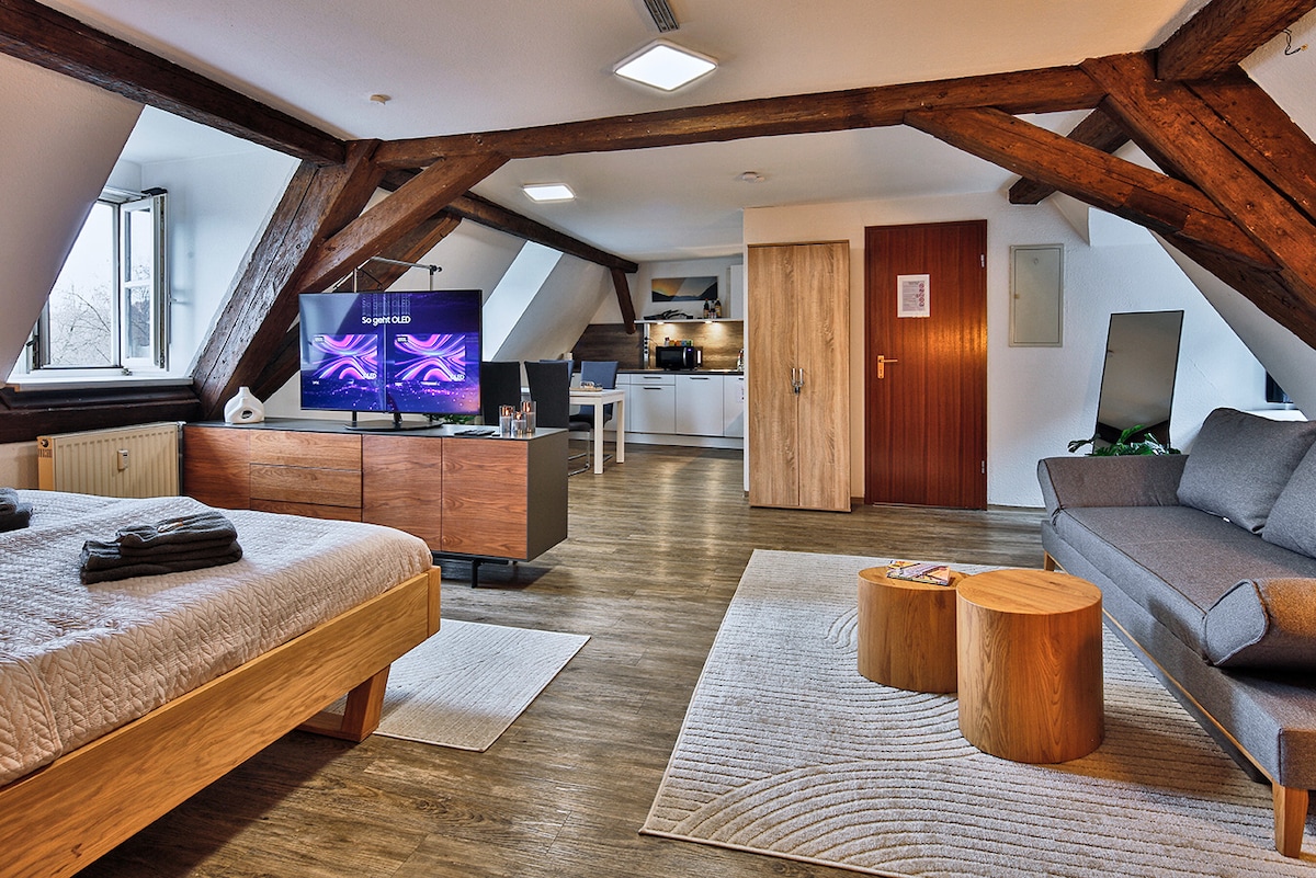 2016年,一棟迷人的舊建築中的閣樓被改建為一間注重細節的單間公寓。幾乎沒有什麼東西可以買到。從小屋頂出口可以俯瞰紐倫堡的屋頂。在舒適而獨特的空間中,您可以感受到家的感覺,並享受寧靜。位於市中心,但非常安靜,乘坐地鐵 10 分鐘即可抵達紐倫堡市中心。