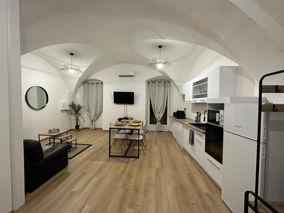 位於卡爾維歷史中心的美麗 T2bis 房源,剛剛翻新。 50 平方公尺公寓,包括: - 1 間設備齊全的開放式廚房/餐廳 - 1 間浴室 - 1 間主臥室 - 一間配有雙層床的小臥室 - 空調 - 露台 - 可折疊沙發 - WiFi 俯瞰海灣和卡爾維鹽塔的壯麗海景和山景。 所有商店都在步行距離內。 步行 500 公尺即可抵達卡爾維海灘 (Plage de Calvi)。 旅遊局和火車站:步行 200 公尺。